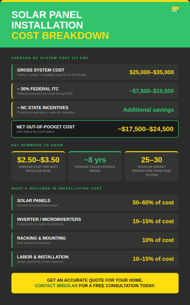 The good news is that federal and state incentives significantly reduce that number. After applying the 30% Federal Investment Tax Credit (ITC), most homeowners bring their net out-of-pocket cost down to $17,500–$24,500 — and additional NC-specific incentives can reduce it further.