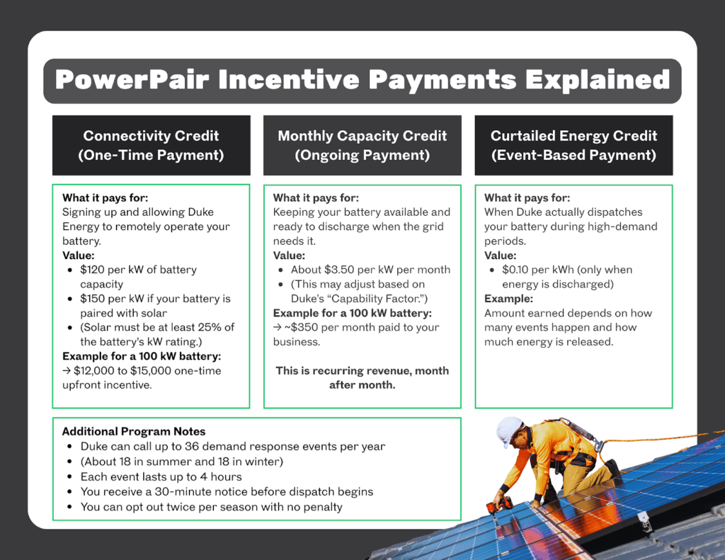 If your business has been considering battery storage or solar energy, understanding this new incentive program is essential. The Commercial PowerPair Incentive offers payments for connecting your battery system to Duke Energy’s grid management system, along with ongoing monthly credits and compensation for energy dispatched during peak demand periods. While the incentive structure differs from the residential program, it opens new possibilities for businesses to monetize their energy storage investments.
