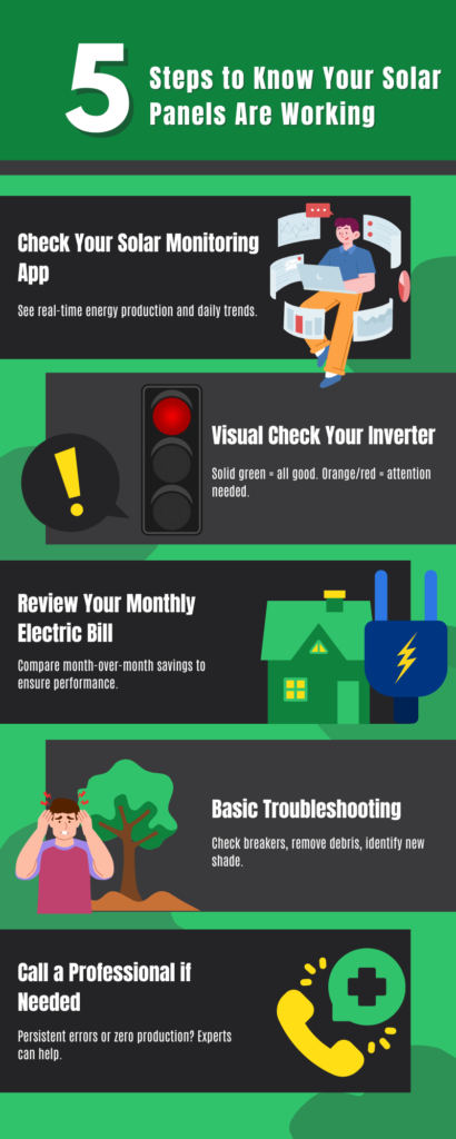 Monitoring your solar system doesn’t have to be complicated. By following these five simple steps—checking your monitoring app, performing a visual inverter check, reviewing your electric bill, trying basic troubleshooting, and knowing when to call a professional—you can make sure your solar investment continues to deliver maximum value year after year.