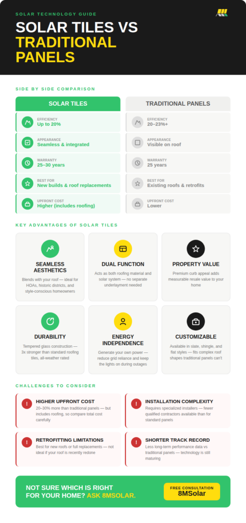 At 8MSolar, we’re committed to being at the forefront of these exciting developments in solar technology. Whether you’re considering traditional solar panels or innovative solutions like solar tiles, our team of experts is here to guide you through the process. We can help you assess your energy needs, evaluate the suitability of your property for solar installation, and choose the best solar solution for your unique situation.