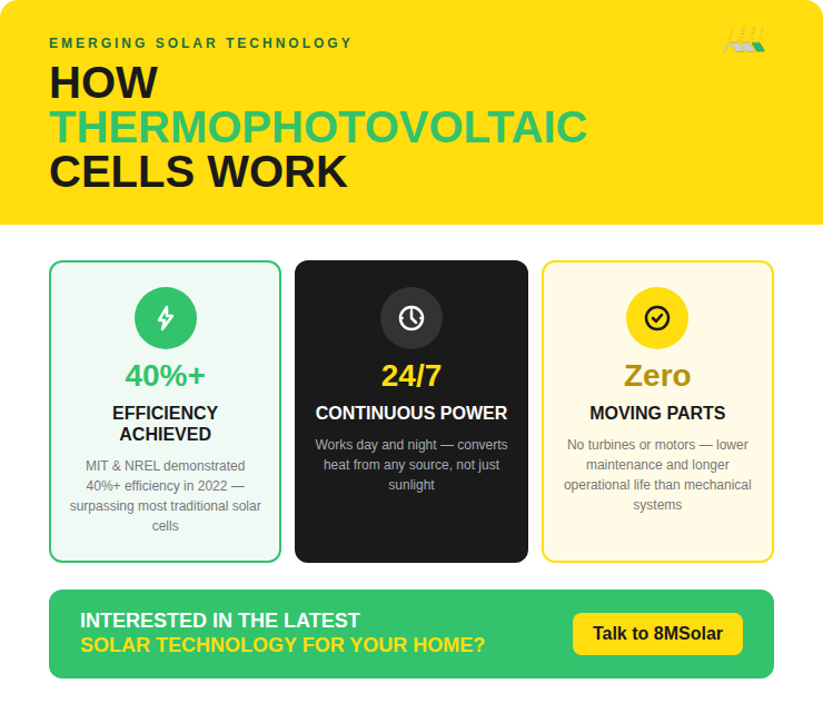 - Continuous Operation: TPV cells can operate day and night as long as there’s a heat source available. This addresses one of the main limitations of traditional solar power – intermittency.